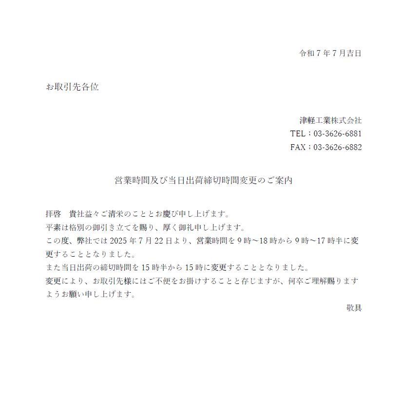 営業時間及び当日出荷締切時間変更のご案内